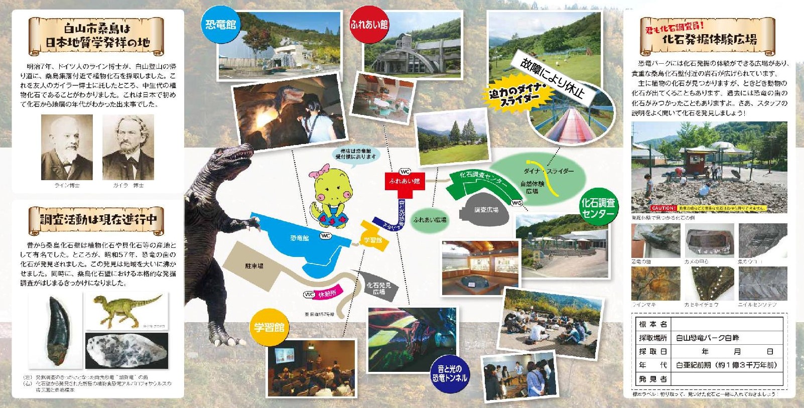 恐竜館:ティラノサウルスがお出迎え ふれあい館:遠足などの休憩場所に 音と光の恐竜トンネル:太古の世界にタイムスリップ 学習館:学術発表が行われることも 化石調査センター:貴重な化石のクリーニングなどを行っています 化石発見広場:さぁ、みんなもたたいてみよう!